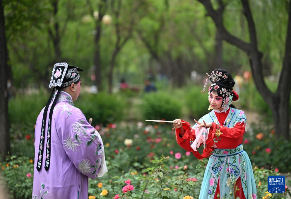 5月5日,演員在天津人民公園為觀眾表演京劇《西廂記》。