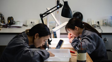 “制墨最后一道工序是描金,就像給老物件換新衣。”申易鑫說著,將壓制成形的一個個長形墨條交給身邊的孩子,指導他們將金粉填入墨條上的牡丹紋樣里,一塊塊“鳳穿牡丹”的描金墨就大功告成了。