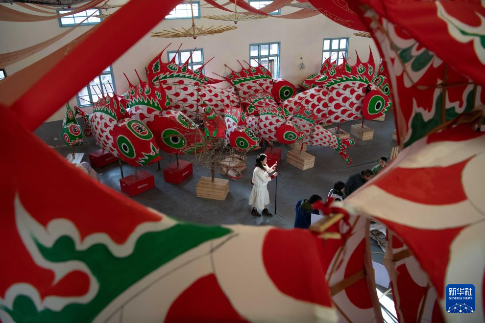 2025年2月8日,在安徽省黃山市歙縣溪頭鎮汪滿田村魚燈工坊內,游客(中)在記錄魚燈制作過程。新華社記者 張端 攝
