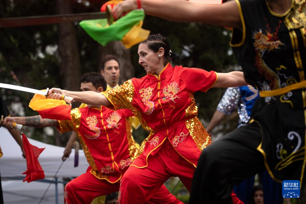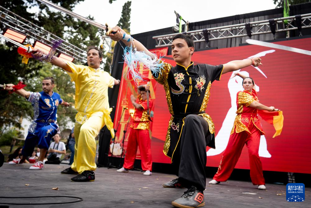 5月4日,人們在阿根廷盧漢舉行的“中國在盧漢”文化節上表演舞劍。