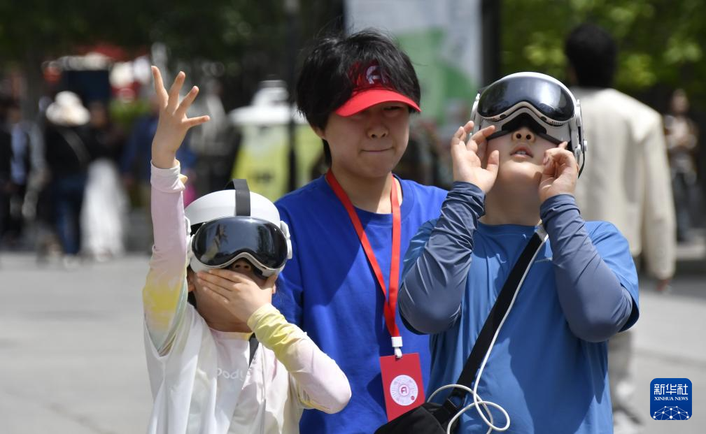 5月4日,游客在798藝術區內戴著VR眼鏡游覽。