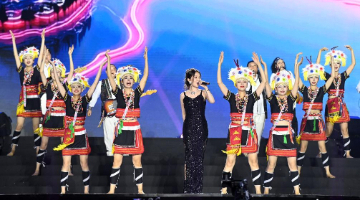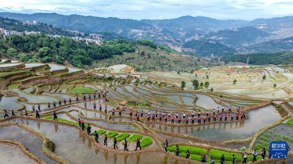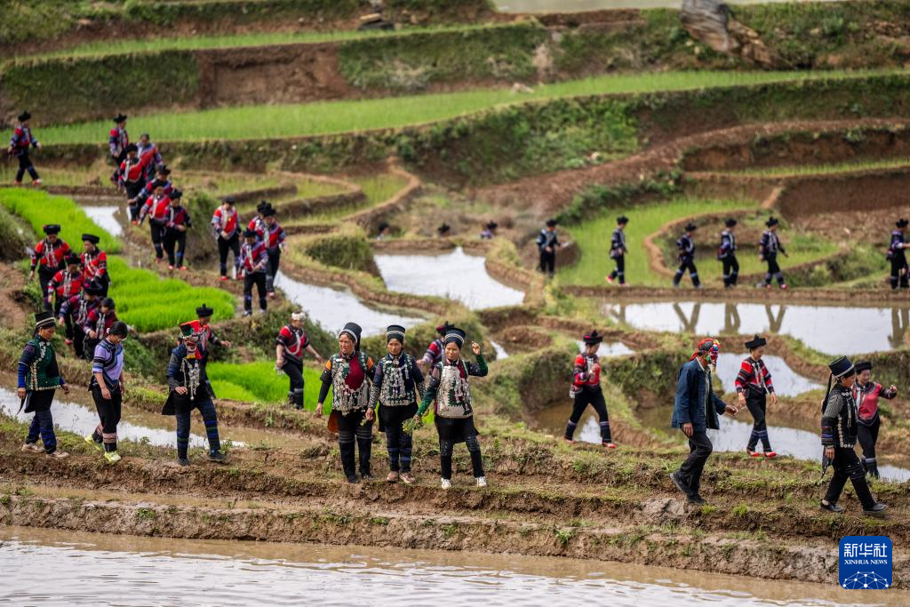 5月2日,在云南省紅河縣甲寅村“開秧門”儀式上,村民身著民族服飾,沿著田埂踏歌而行。