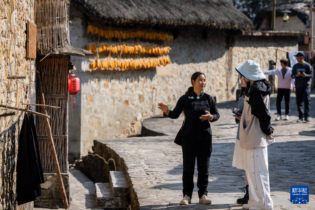 2月28日,在云南省元陽縣阿者科村,村民導游高美華(左)在為游客講解。