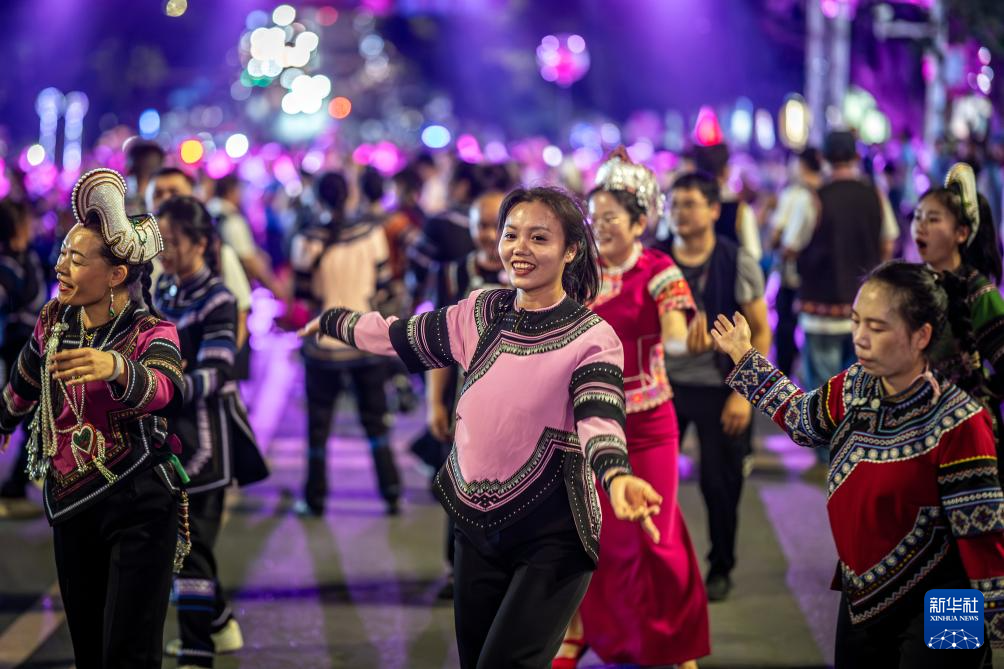 5月1日,在云南省紅河縣蓮花大道,游客和當地群眾在參加萬人樂作舞會。