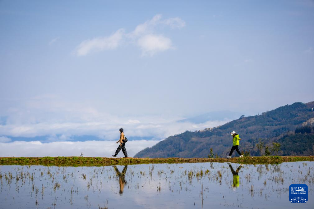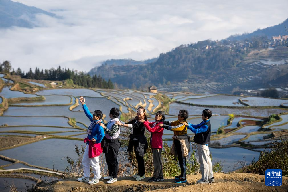 2月26日,游客在云南省元陽縣阿者科村的梯田游覽。