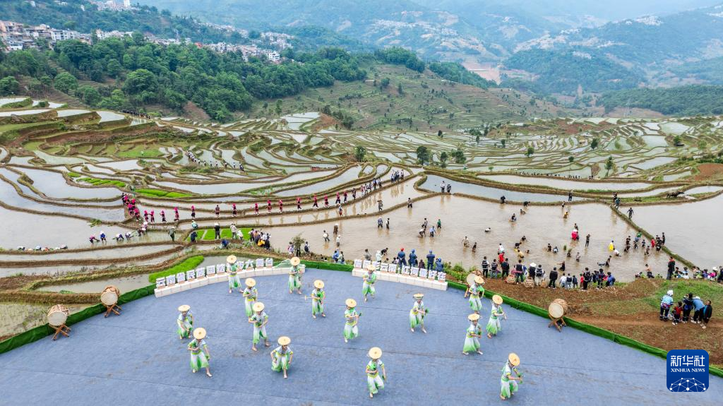 5月2日,在云南省紅河縣“開秧門”活動現場,演員以梯田為背景表演(無人機照片)。