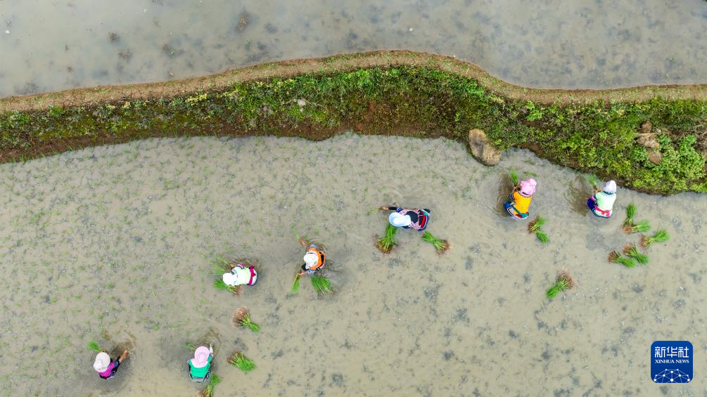 5月2日,在云南省紅河縣甲寅村,村民在梯田里插秧(無人機照片)。