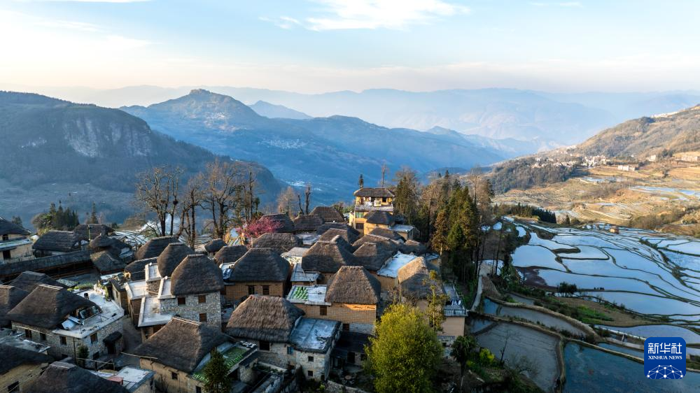 這是2月27日在云南省元陽縣阿者科村拍攝的傳統民居“蘑菇房”和梯田(無人機照片)。