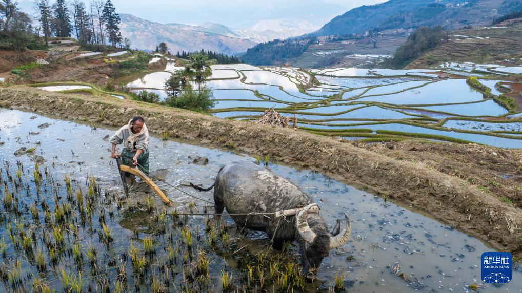 2月26日,在云南省元陽縣阿者科村,村民在驅牛犁田(無人機照片)。