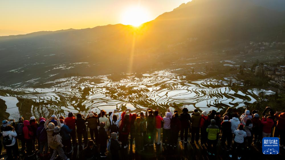 2月27日,游客在云南省元陽縣多依樹景區看日出(無人機照片)。