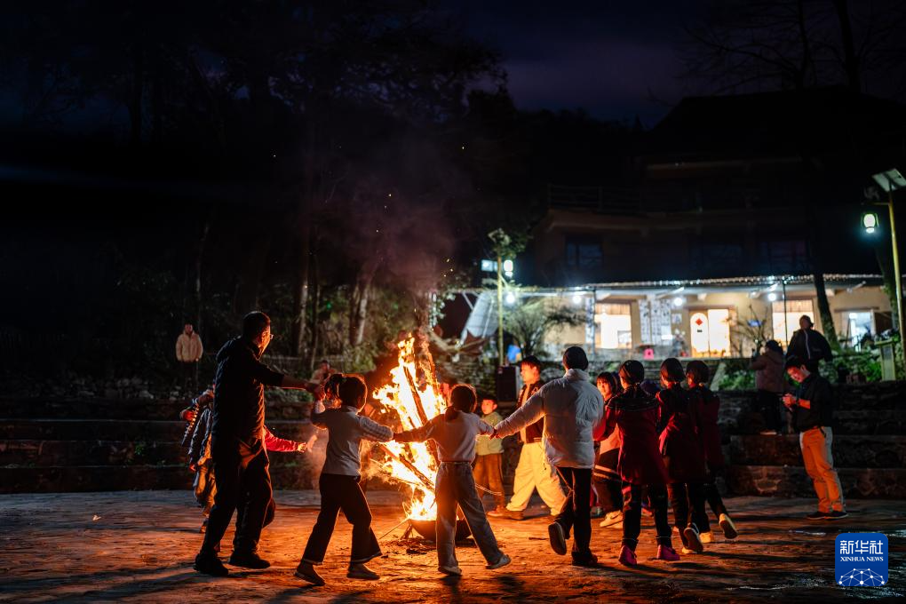 2月26日,在云南省元陽縣多依樹村,哈尼族群眾和游客圍著篝火跳樂作舞。