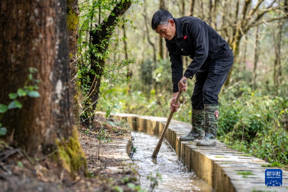 2月26日,在云南省元陽縣阿者科村,“趕溝人”高有明在清理水渠中的樹葉和垃圾,維系梯田的水源暢通。