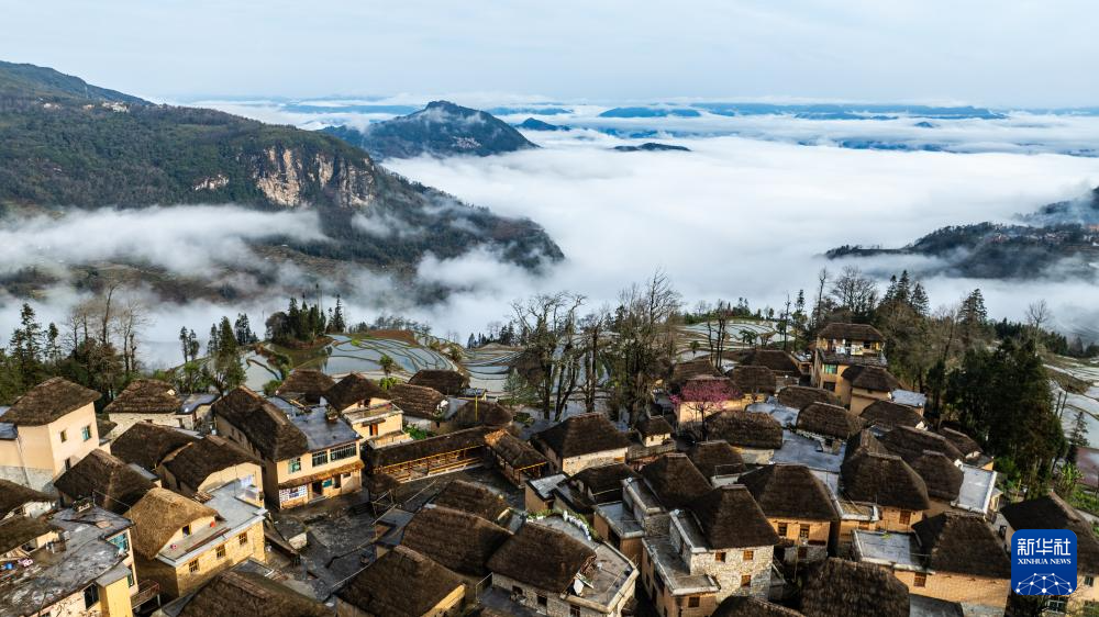 這是2月26日拍攝的云南省元陽縣阿者科村的“蘑菇房”與云海、梯田(無人機照片)。
