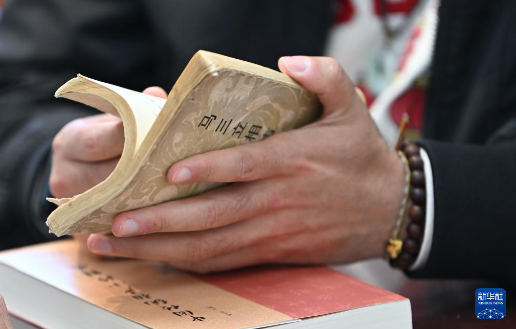 4月24日,在天津市東麗區金橋養老中心(馬三立老人院),吳瑞龍翻看《馬三立相聲選》。