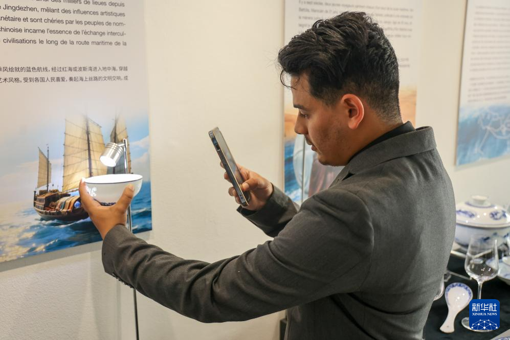5月9日,在摩洛哥首都拉巴特舉行的“茶和天下·雅集”暨“江西風景獨好”摩洛哥“江西日”活動的江西非遺技藝展演現場,一名摩洛哥觀眾拍攝一件景德鎮青花玲瓏瓷碗。