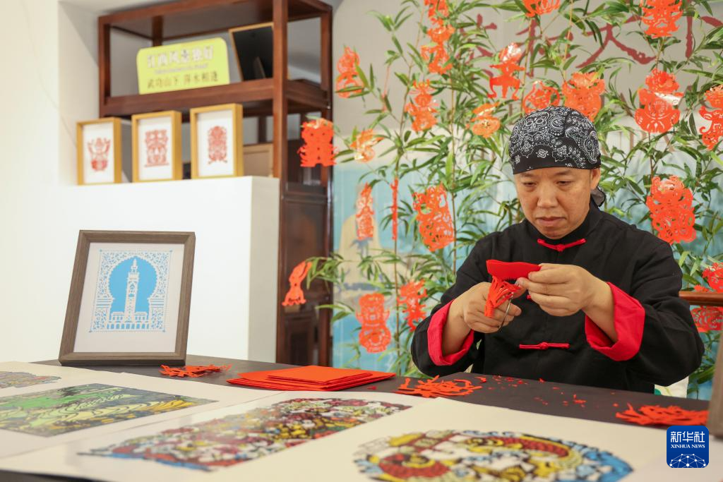 5月9日,在摩洛哥首都拉巴特舉行的“茶和天下·雅集”暨“江西風景獨好”摩洛哥“江西日”活動的江西非遺技藝展演現場,手工藝者展示剪紙技藝。