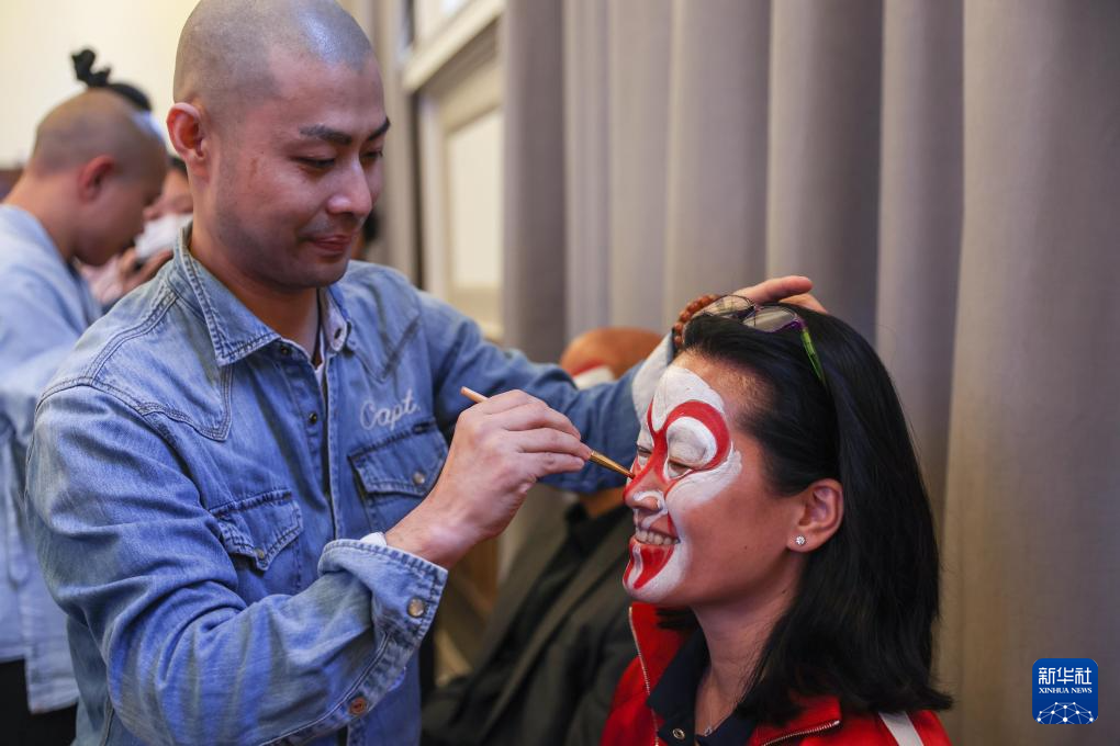 5月9日,在2025“知音湖北·京韻四海”新西蘭奧克蘭京劇專場演出間隙,觀眾上臺體驗京劇藝術。