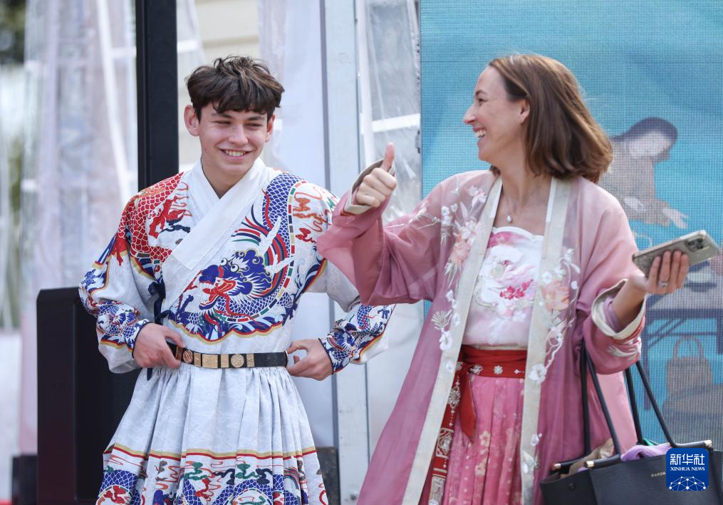 5月11日,在新西蘭奧克蘭,游客在“茶和天下”·雅集游園活動上體驗漢服。