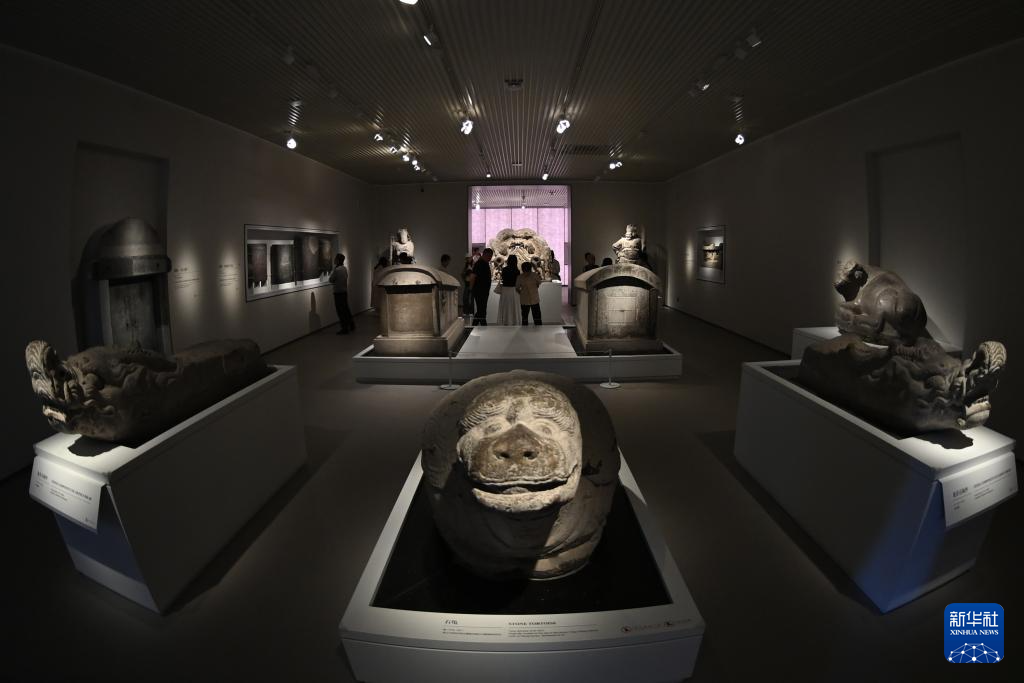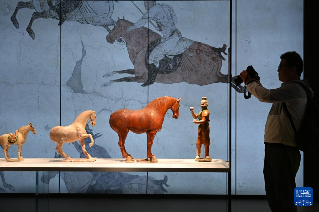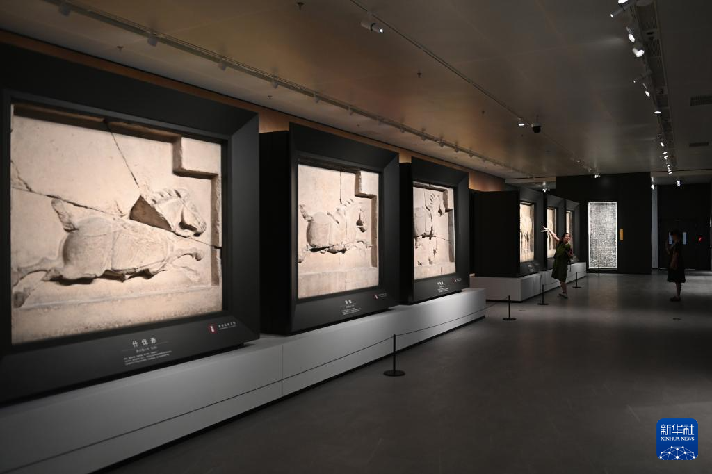 5月12日,游客在改擴建后的西安碑林博物館北區場館參觀昭陵六駿石雕。