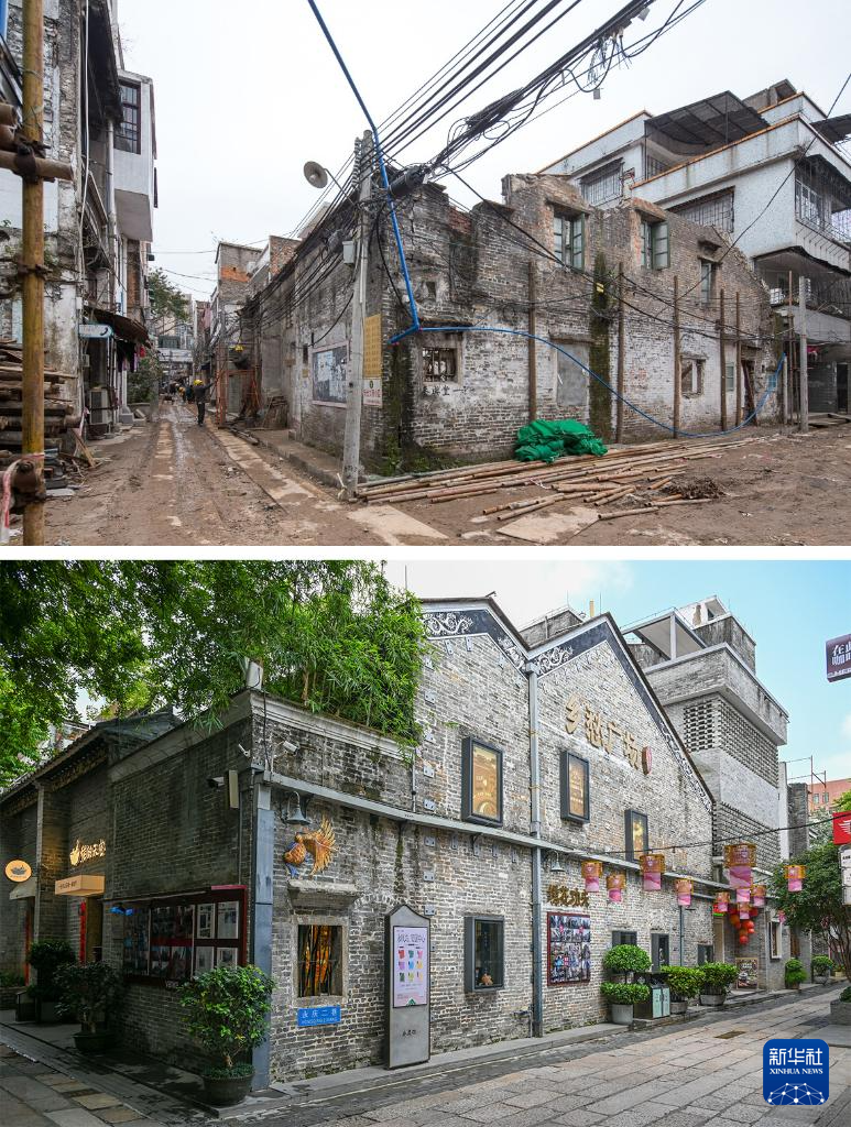 這是一張拼版照片:上圖為改造前的永慶大街(資料照片,新華社發);下圖為2025年5月13日拍攝的永慶坊永慶大街(新華社記者陳朔攝)。