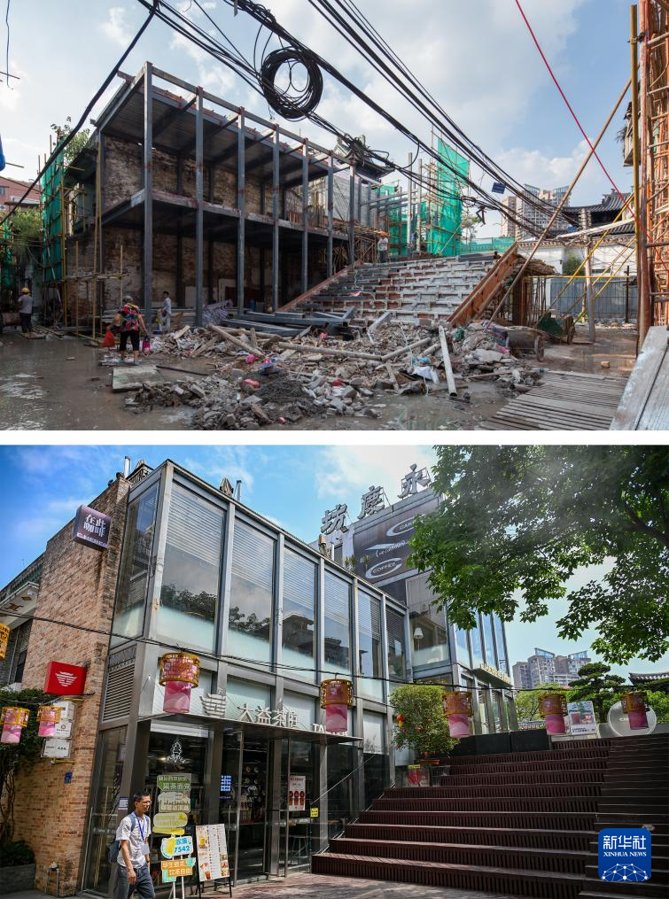這是一張拼版照片:上圖為改造前的鄉愁廣場(資料照片,新華社發);下圖為2025年5月13日拍攝的永慶坊鄉愁廣場(新華社記者陳朔攝)。