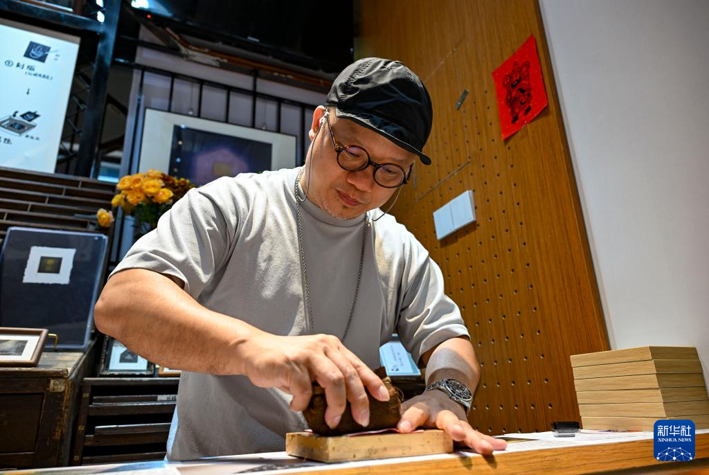 永慶坊一家活字印刷店店主賴朝陽在制作活字印刷裝飾品(5月13日攝)。
