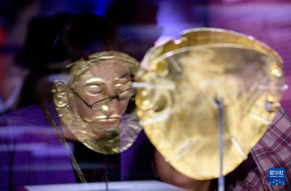 5月18日,游客在山東省青州博物館參觀展出的文物。