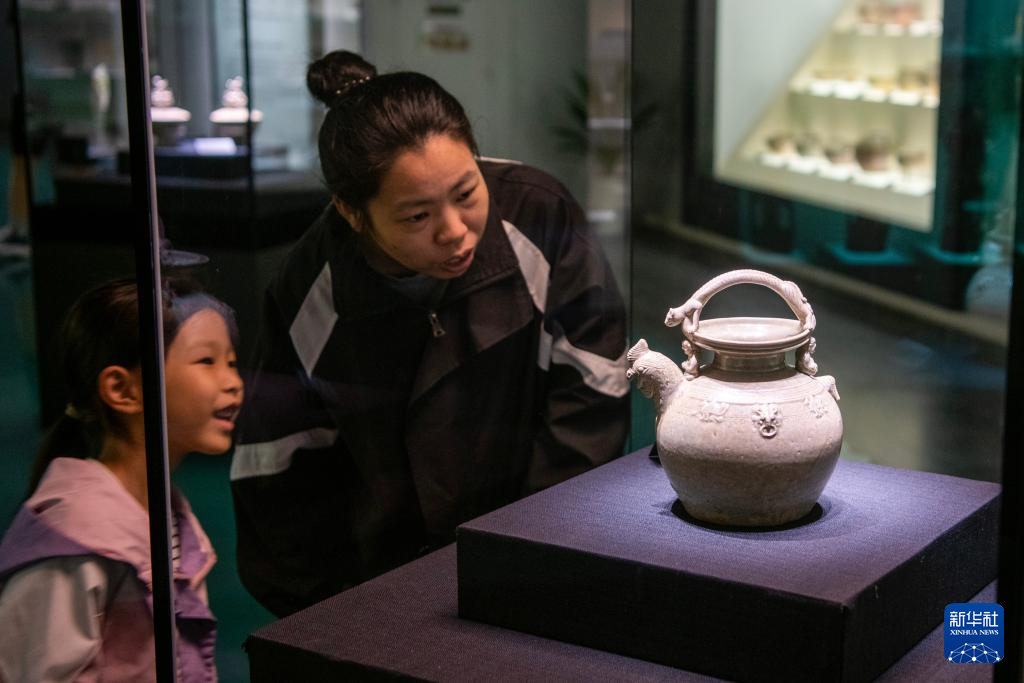 5月18日,小朋友和家長在浙江省余姚博物館參觀西晉越窯青釉黃鼬把瓷雞首壺。