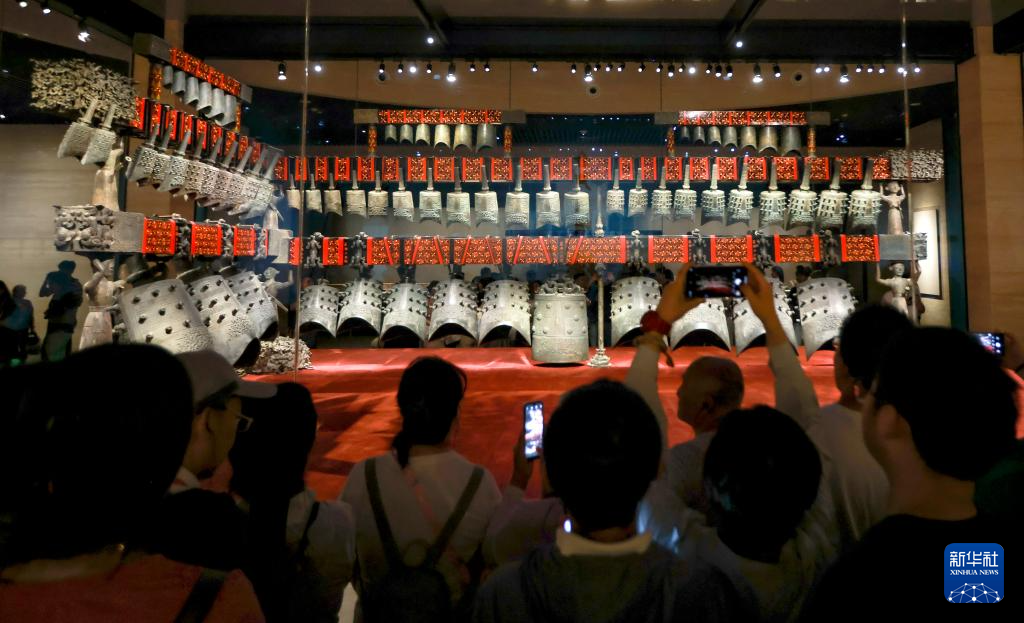 5月18日,觀眾在湖北省博物館內參觀編鐘文物。