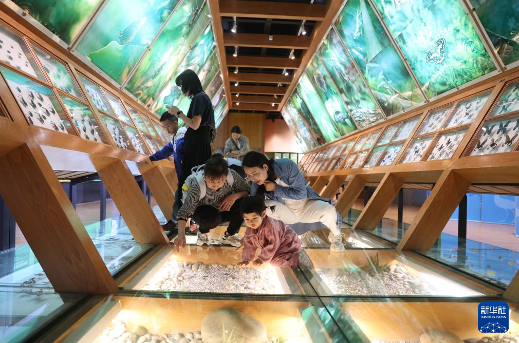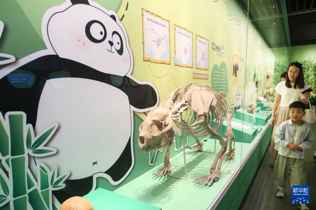 5月18日,家長帶著孩子在江蘇常州博物館參觀熊貓時代科普特展。