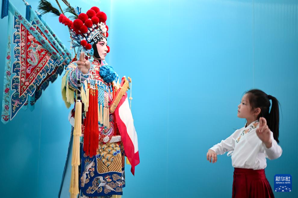 5月18日,小朋友在江蘇省昆山戲曲百戲博物館模仿演員動作。