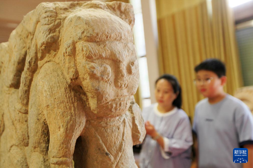 5月18日,游客在山東省臨沂市平邑縣博物館參觀展出的漢代石刻文物。