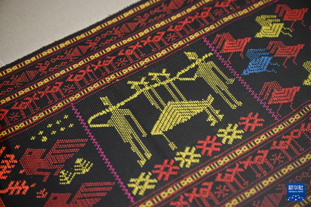 5月12日在位于海南保亭的保亭黎族苗族自治縣非物質文化遺產名錄陳列館拍攝的織有黎族生活場景圖案的黎錦。