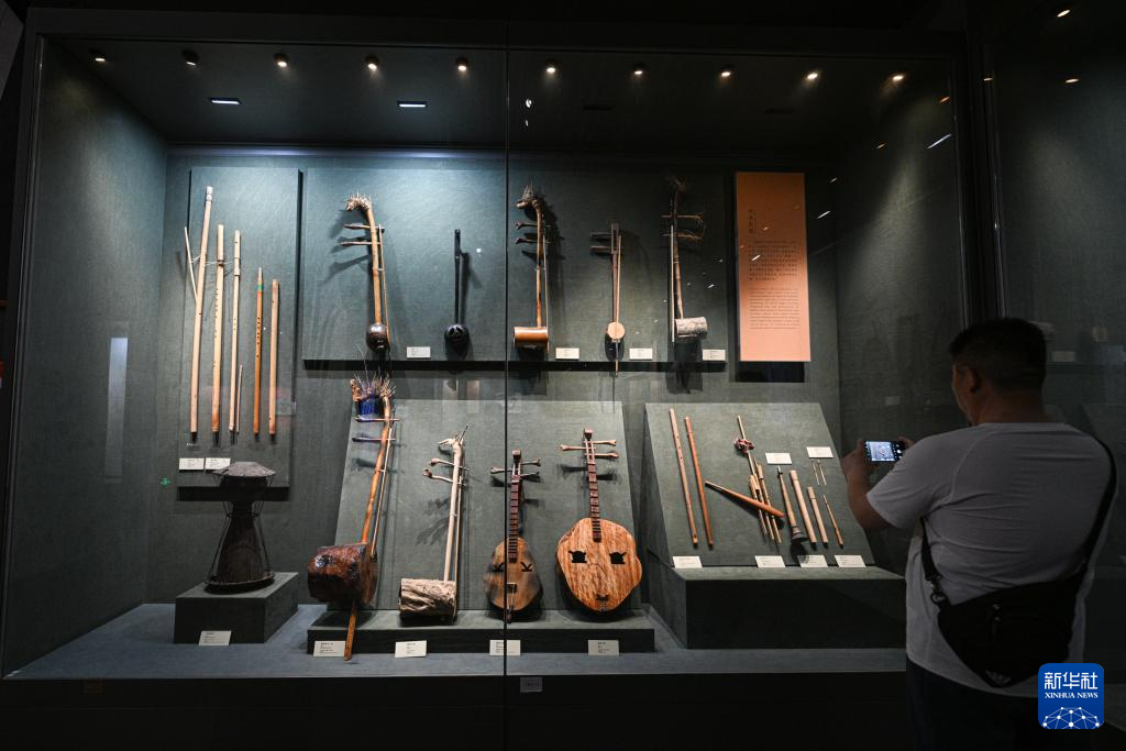 5月16日,游客在位于海南五指山的海南省民族博物館觀看黎族竹木樂器。