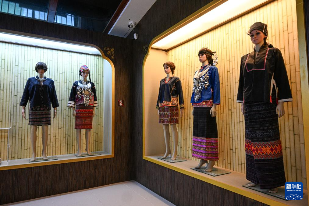 5月12日在位于海南保亭的保亭黎族苗族自治縣非物質文化遺產名錄陳列館拍攝的黎族服飾。