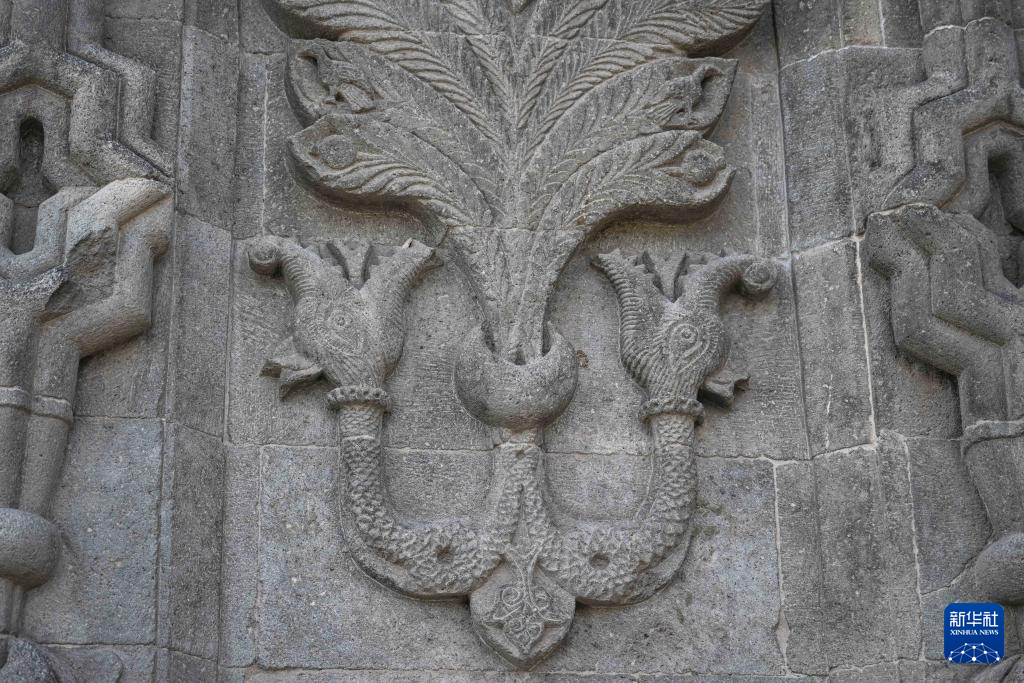這是4月27日在土耳其埃爾祖魯姆一座建筑上拍攝的“雙龍頭”圖案。新華社記者 劉磊 攝