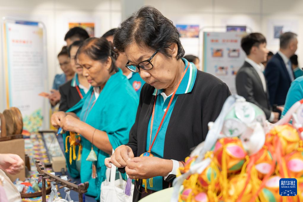 5月16日,老撾民眾在首都萬象舉行的“茶和天下·雅集”暨廣西文化旅游推介會上參加壯錦非遺體驗活動。