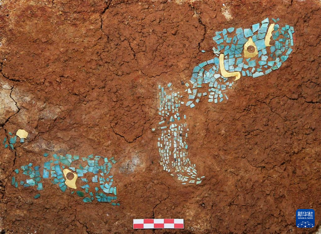 湖北黃陂盤龍城遺址楊家灣M17出土的金片綠松石鑲嵌飾(資料照片)。新華社發(全國十大考古新發現活動辦公室供圖)