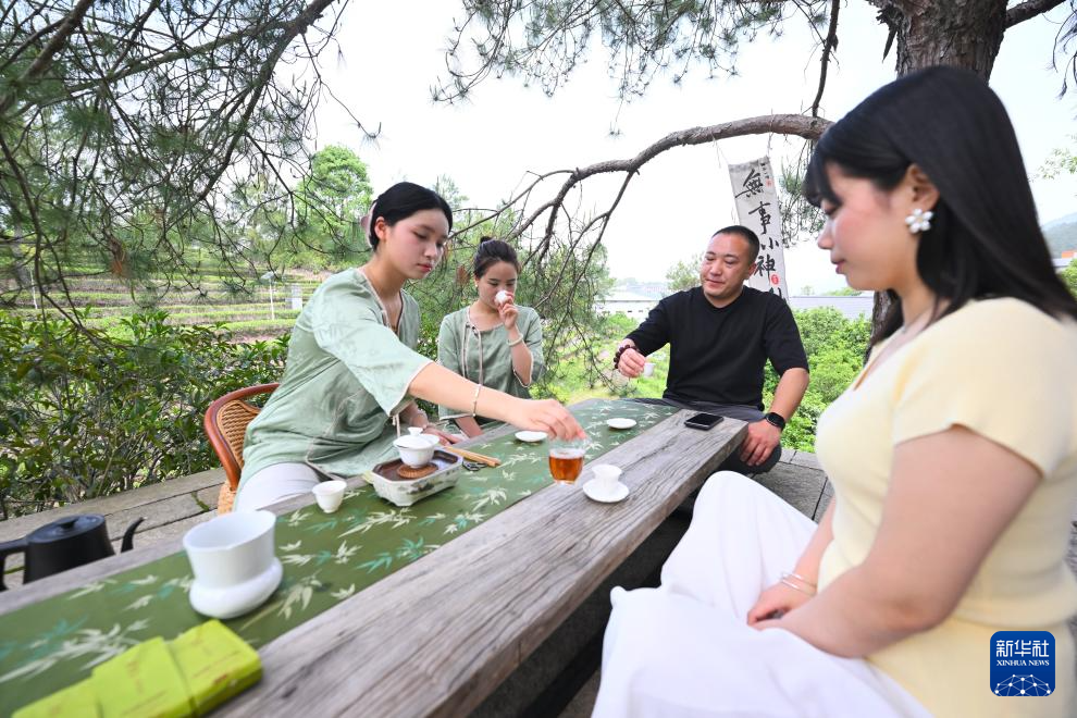 武夷山市星村鎮年輕茶農通過網絡直播推介自己制作的新茶(2024年7月11日攝)。