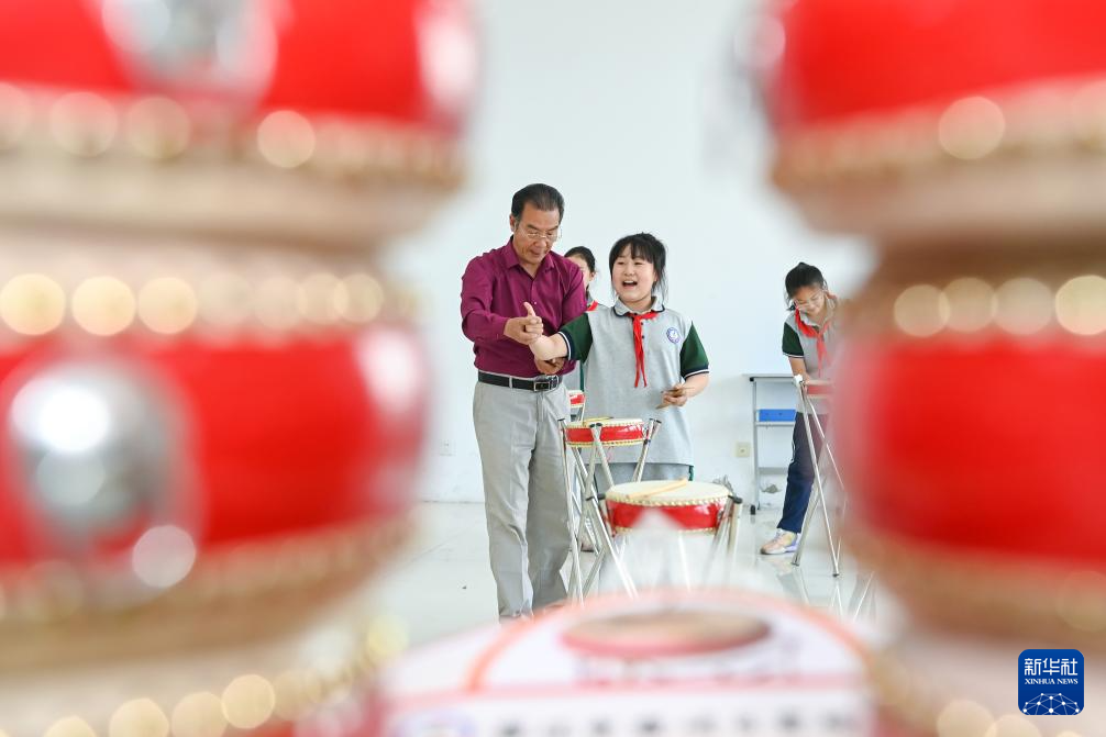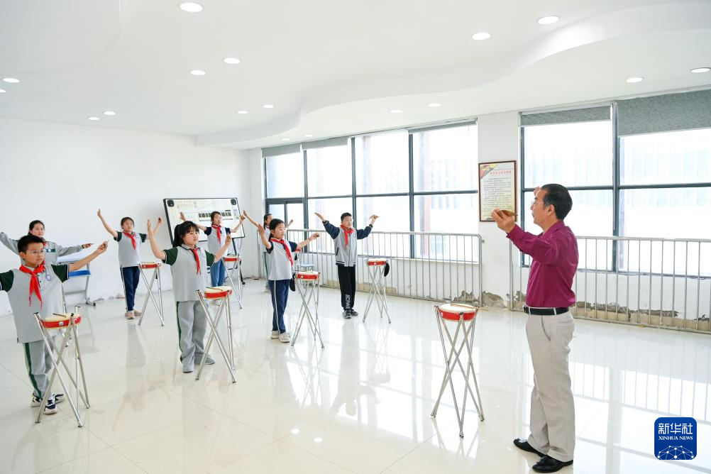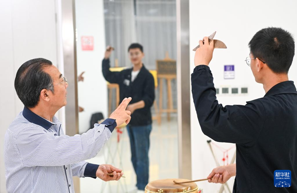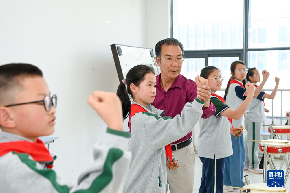 5月12日,宿遷市宿城區實驗小學非遺教室內,學生在牛崇祥的指導下學習蘇北大鼓。