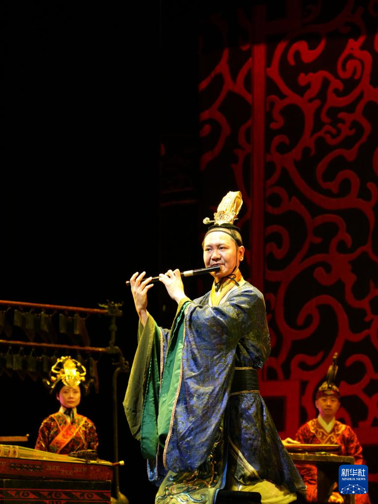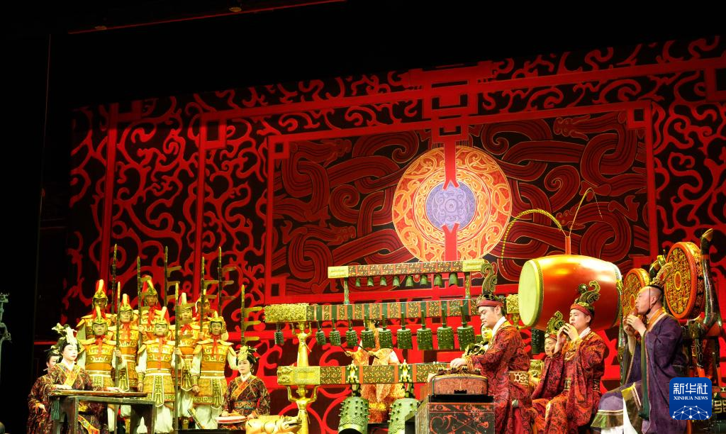5月20日,演員在法國巴黎莫加多劇院里向觀眾呈現大型音樂舞蹈史詩《編鐘樂舞》。新華社記者 唐霽 攝
