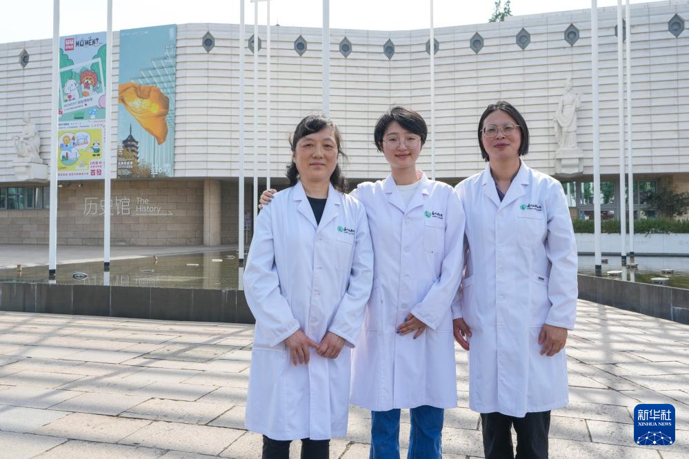 陳琰璐(中)和團隊成員孟小紬(左)、張國華在蘇州絲綢博物館合影(5月19日攝)。