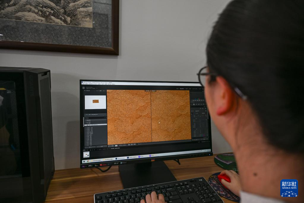 工作人員對文物補料樣品照片進行校色(5月18日攝)。