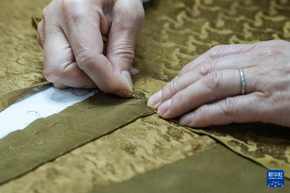 孟小紬在對織物進行針線修復(5月18日攝)。