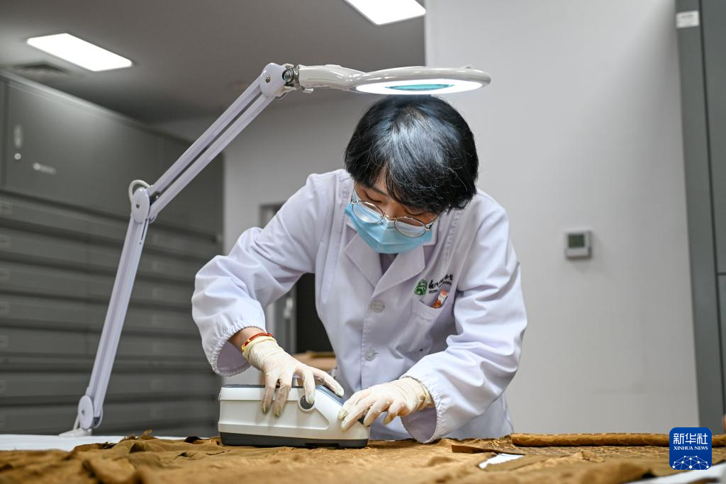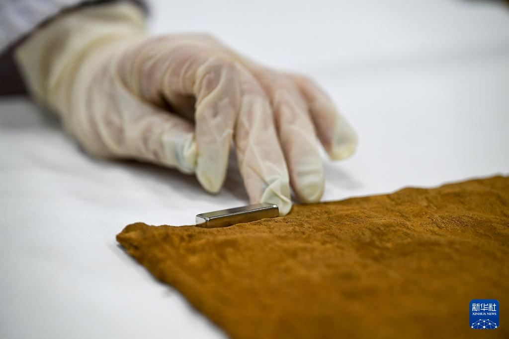 陳琰璐將絲綢文物放置在鐵質工作臺,使用磁鐵為衣物進行平整矯形(5月18日攝)。