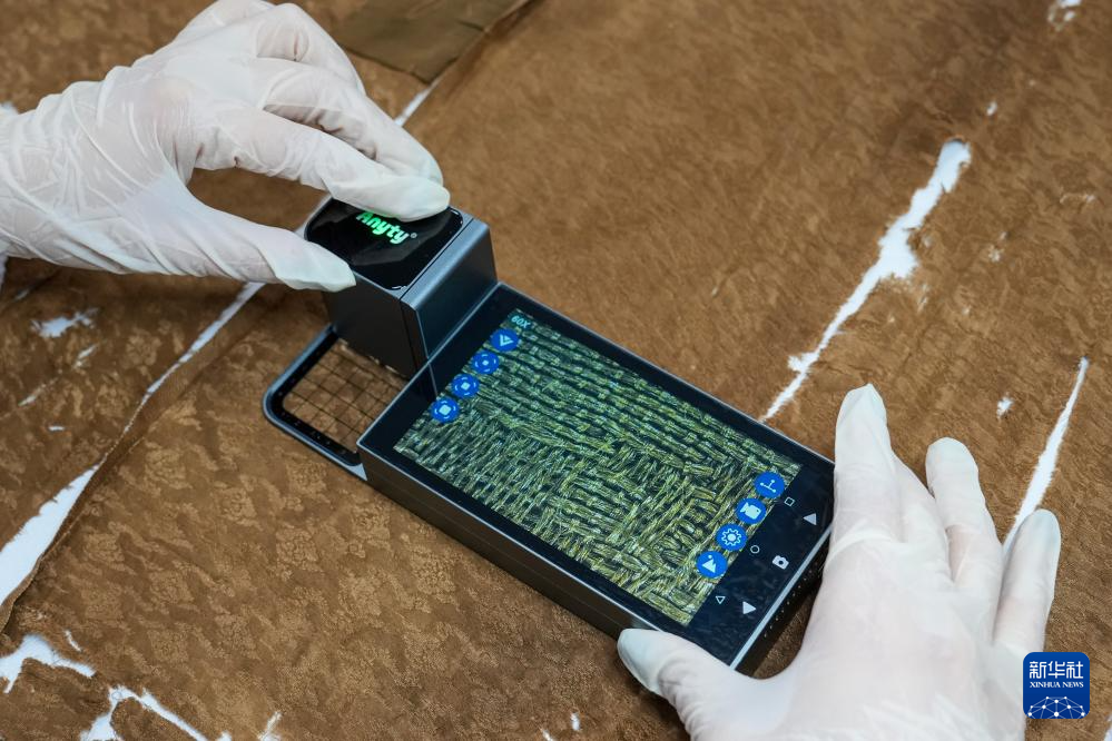 陳琰璐使用便攜式顯微鏡對織物進行檢測分析(5月18日攝)。