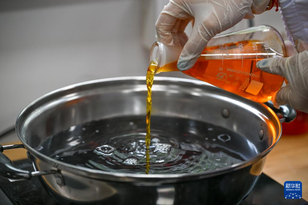 陳琰璐把補色的染料倒進容器里,準備進行染色(5月18日攝)。