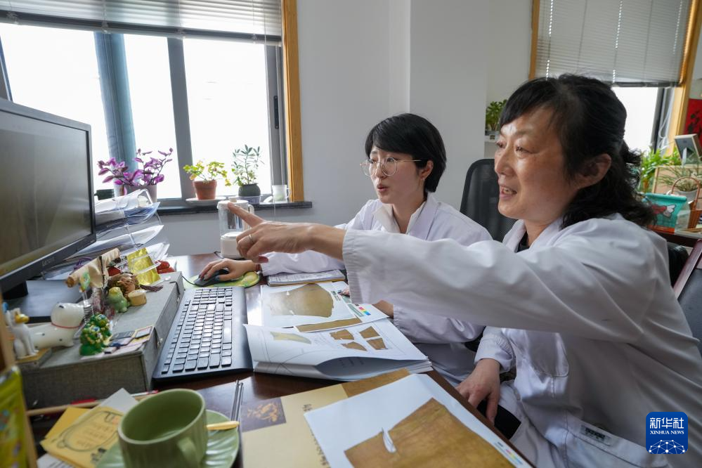 陳琰璐(后)和孟小紬在討論文物修復方案(5月18日攝)。