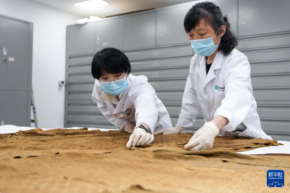 陳琰璐(左)和孟小紬在整理明代四合如意云紋緞褡護(5月18日攝)。這件衣服衣長122厘米,通袖長116厘米,2002年在蘇州市相城區出土,出土時織物破損嚴重。團隊對文物進行全面“體檢”,從除蟲滅菌、清理、平整,到配置修復面料、染色,再到針線縫合加固,目前這件文物的修復工作已經持續三個多月。