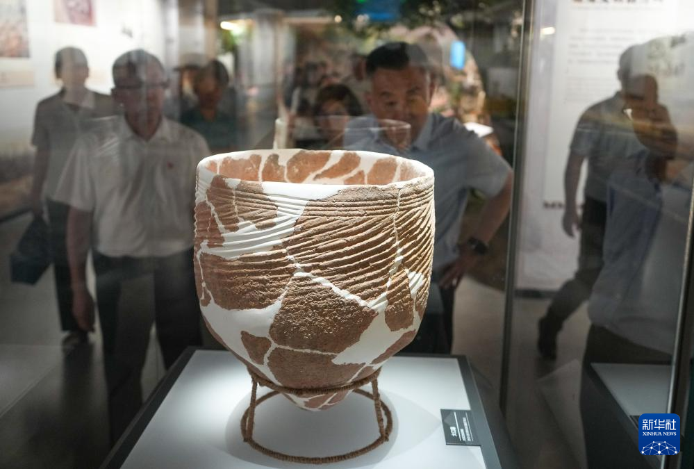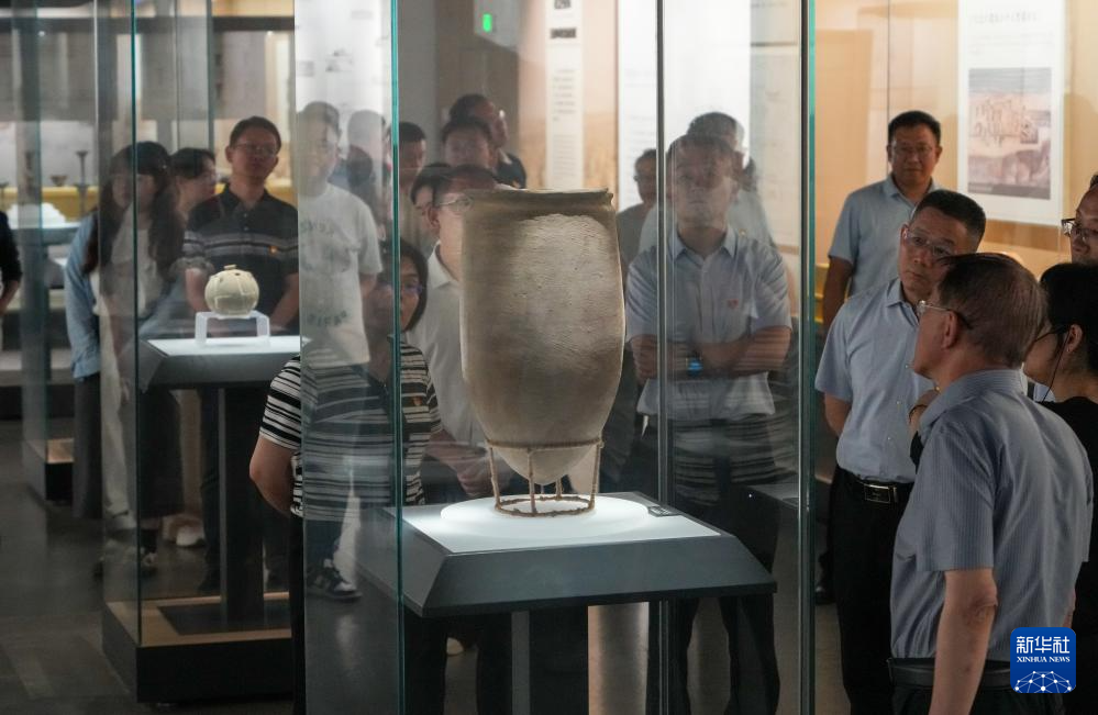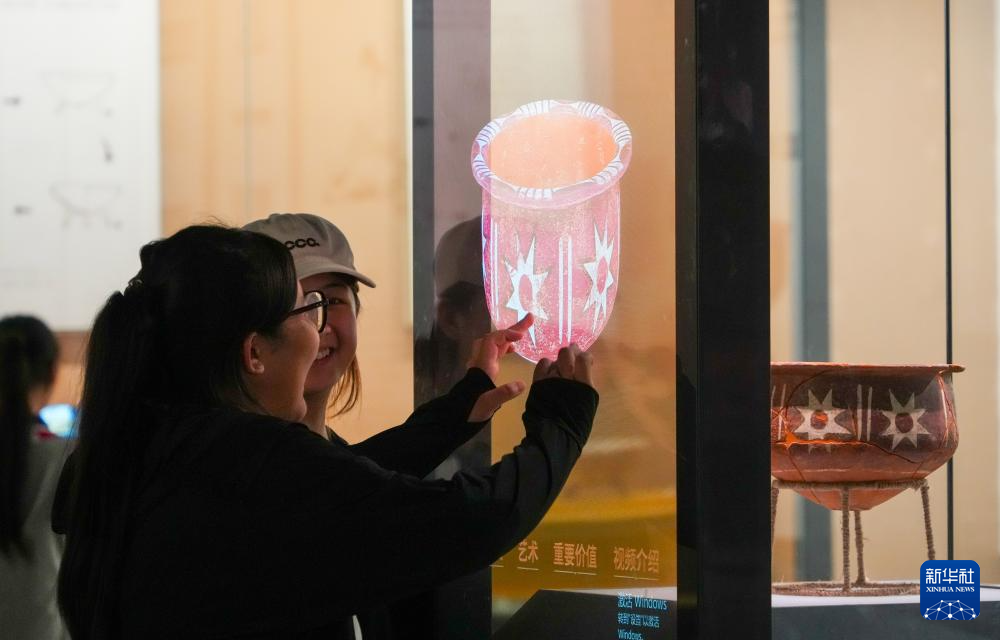 5月20日,人們在大汶口遺址博物館通過多媒體設備多角度觀看大汶口遺址出土的八角星紋彩陶豆。